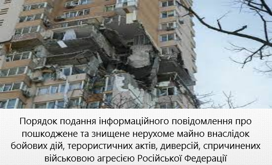 Порядок подання інформаційного повідомлення про пошкоджене та знищене нерухоме майно внаслідок бойових дій, терористичних актів, диверсій, спричинених військовою агресією Російської Федерації