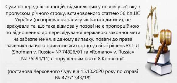 Суди попередніх інстанцій, відмовляючи у позові у зв'язку з пропуском річного строку, встановленого статтею 56 КпШС України, не врахували те, що така відмова у позові не є пропорційною по відношенню до переслідуваної державою законної мети на забезпечення, в даному випадку, поваги до права заявника на його приватне життя, що у світлі вищенаведених рішень ЄСПЛ є порушенням статті 8 Конвенції.